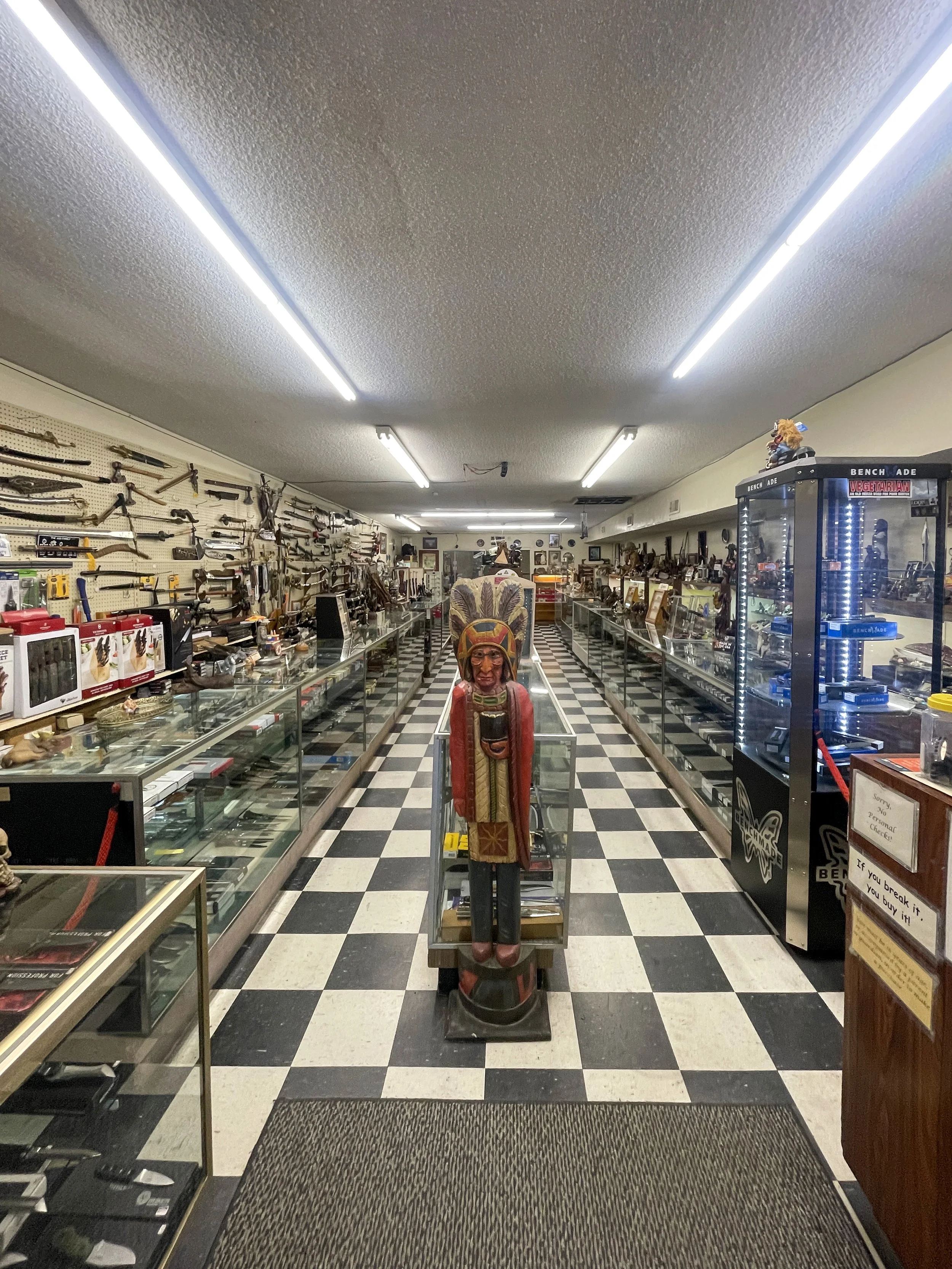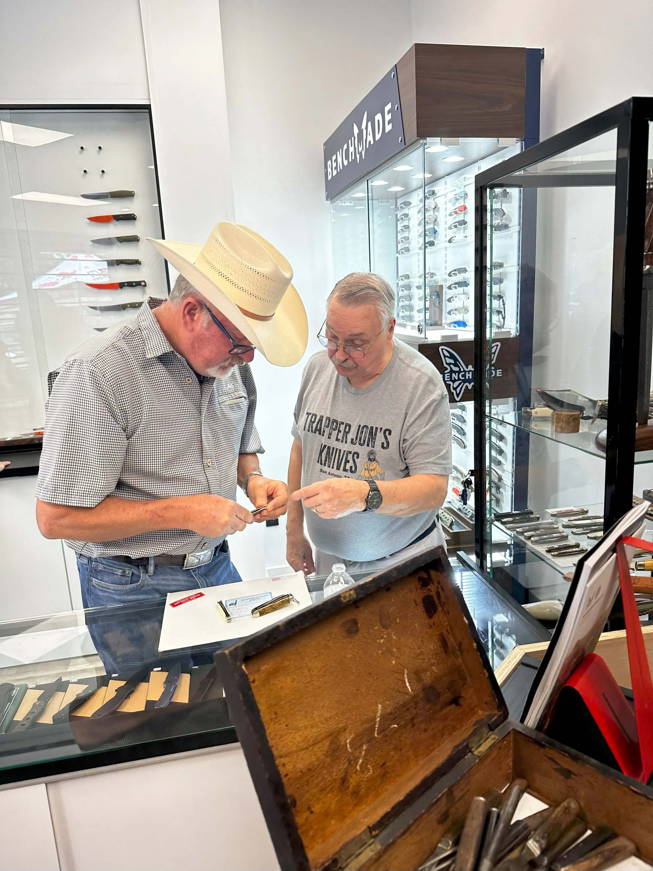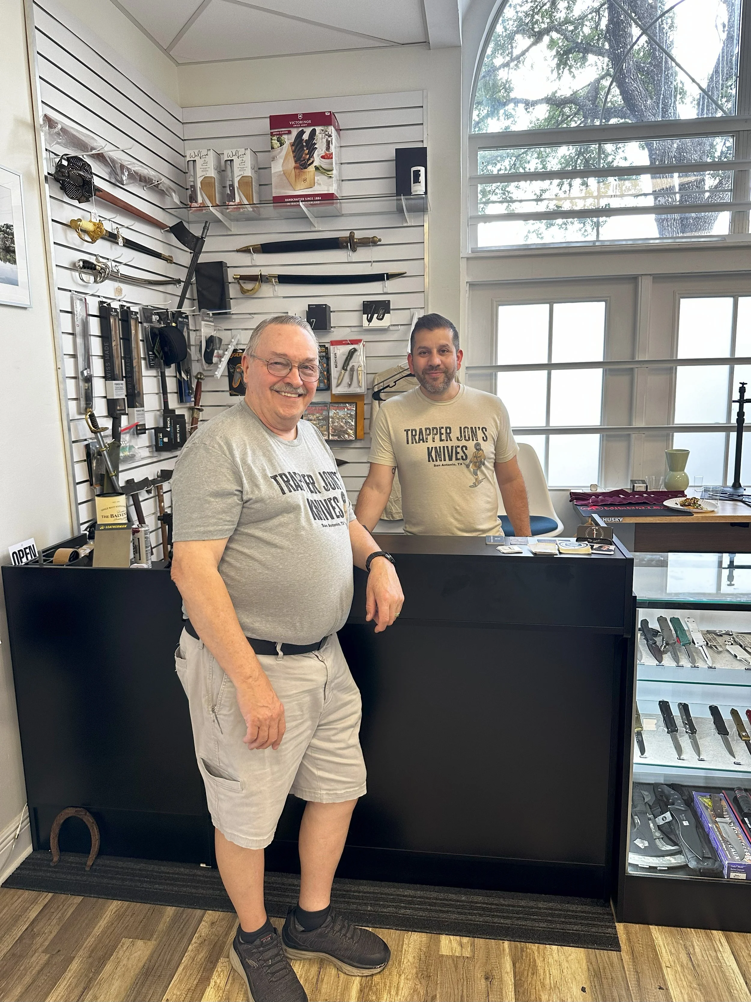 When Jon was ready to retire, Carlos asked to carry the light forward. In 2023 he acquired the store and its full inventory; in 2024, Trapper Jon’s reopened in San Antonio with the same quiet promises and a new skyline. Today the shop feels both familiar and new: thoughtfully organized displays, an expanded roster of trusted brands including Spyderco, Benchmade, Microtech, Chaves, and Flytanium, a small lounge for unhurried conversations, and regular events that make learning part of the visit.. Prices still span from ten-dollar utility to heirloom and collector pieces, organized so beginners, EDC fans, cooks, hunters, and collectors can find their lane and compare, with staff-presented fits on request. The old lives on here– the original Arizona sign hangs in view, and those black-and-white catalogs remain within reach, not as relics but as working memory. The ritual has not changed: listen first, fit the knife to the hand, match the tool to life. Small business, strong legacy. What began at Jon Carpenter’s house continues, proudly, wherever the sign is lit.